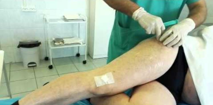 - при наружном доступе игла вводится непосредственно в верхнюю точку большого вертела под прямым углом до упора в кость. Потом она продвигается вдоль бедренной шейки вверх на 2-3 см до проникновения в суставную полость.
