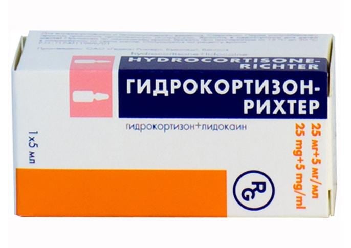 - Гидрокортизон. Суспензия Гидрокортизон Рихтер с активными ингредиентами Гидрокортизоном и Лидокаином вводится периартикулярно или в полость сустава;