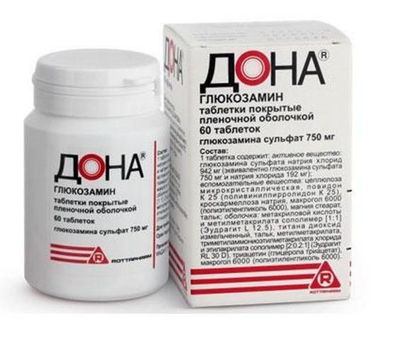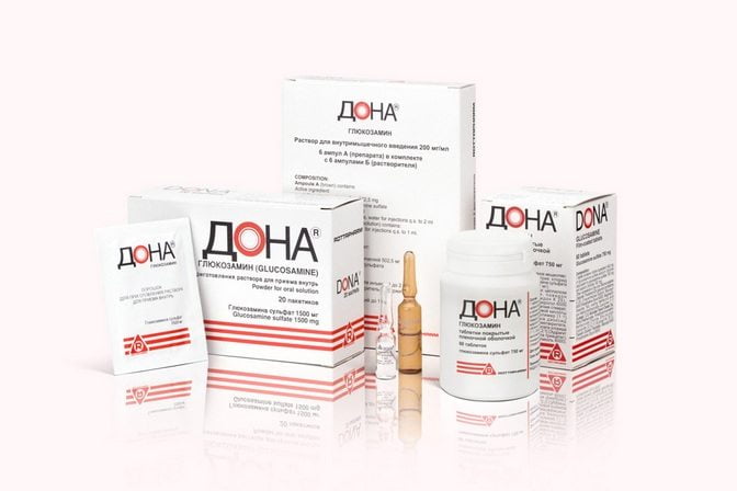 Лекарство Дона — хондропротекторный препарат, главное действующее вещество — глюкозамин. Лекарство представляет собой порошок для приготовления растворов, таблетки или уколы. По результатам исследований, порошок Доны позволяет: