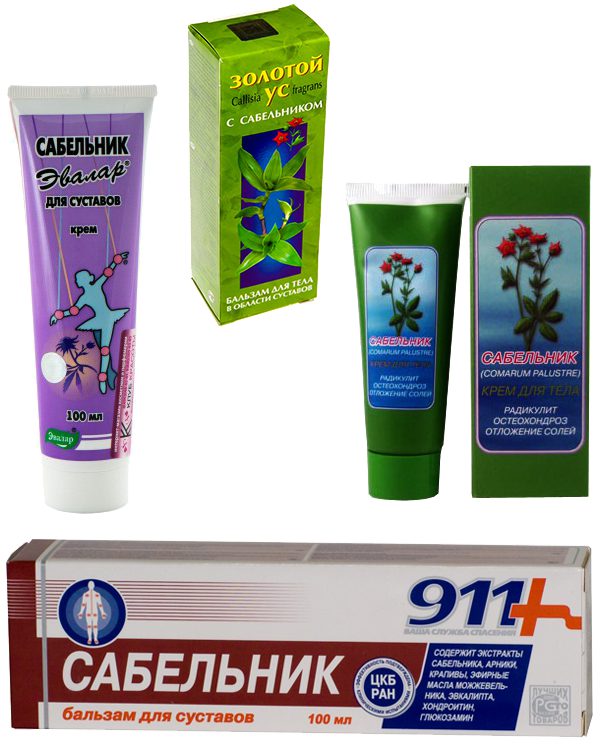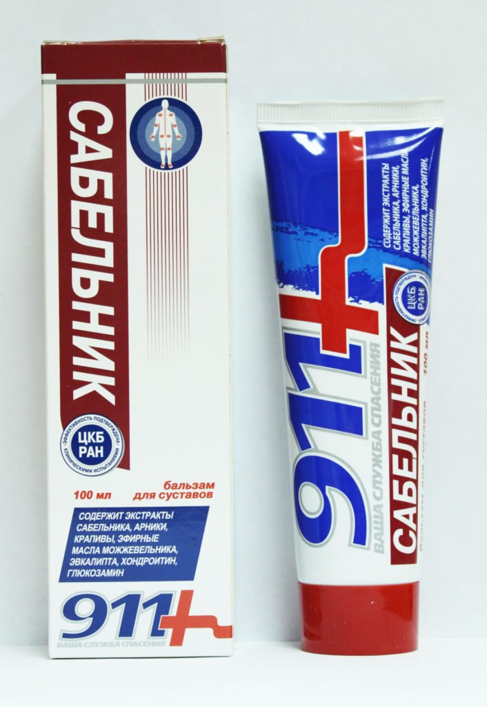 | Гель-бальзам с сабельником из серии 911 | Экстракт сабельника, камфора, экстракты арники и крапивы, глюкозамина гидрохлорид, хондроитина сульфат, масло можжевельника, масло эвкалипта, масло чабреца |
