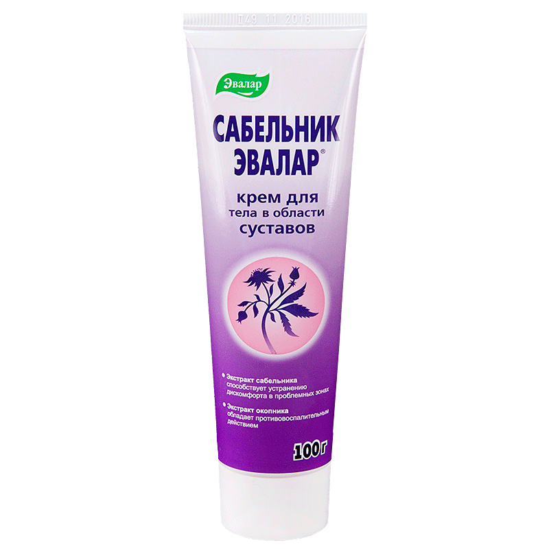 Фармацевтическая фабрика Эвалар производит разнообразные биологически активные добавки. Она выпускает крем Сабельник, расфасованный в пластиковые тубы по 50 и 100 мл. Вторичная упаковка — картонная коробка с вложенной внутрь аннотацией. Кроме водно-спиртового и масляного экстрактов растения, в состав препарата входят следующие ингредиенты: