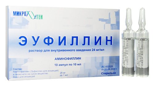 | Эуфиллин | Раствор 0,024/мл, 5мл N10 — 60;Таблетки 0,15 №30 — 30 |