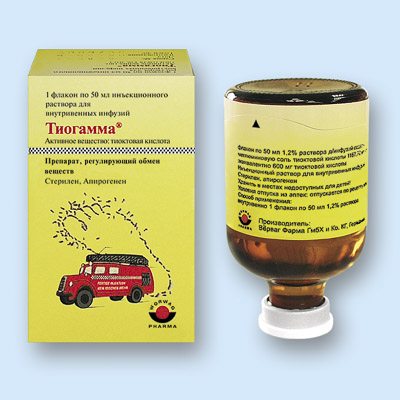 - Тиоктовая кислота (Тиогамма, Берлитион, Октолипен). Улучшает обмен триглицеридов и углеводов, предупреждает повреждение клеток свободными радикалами. Расширяет кровеносные сосуды, усиливает кровоток, восстанавливает работу нейронов, нормализует энергетические процессы в центральной и периферической нервной системе. Благодаря оптимизации кровообращения клетки головного мозга перестают испытывать недостаток питательных веществ и молекулярного кислорода;