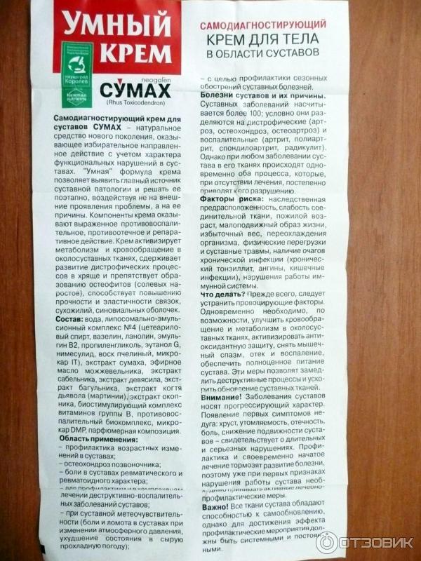 Чтобы выздоровление наступило быстрее, выбирайте натуральный крем для суставов – умный крем Сумах изготовлен на растительной основе, не содержит агрессивных химических веществ.