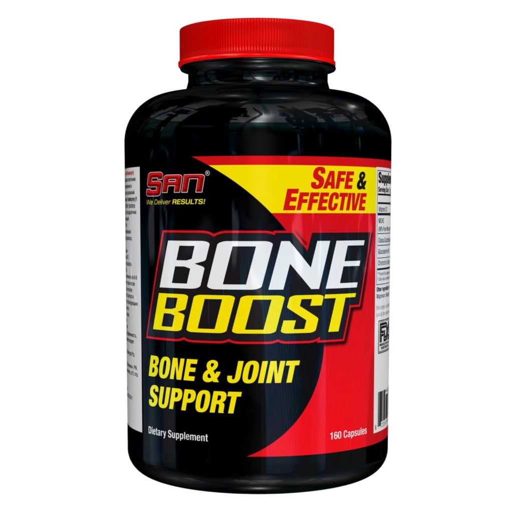 - Bone Boost от SAN. В состав входят глюкозамин, хондроитин, метилсульфонилметан, витамин D3, коллаген. Улучшает подвижность суставов, повышает эластичность связок и сухожилий, укрепляет костную ткань. Длительность терапевтического курса — 1-2 месяца. В течение дня следует принимать по 8 капсул после тренировки и перед сном;