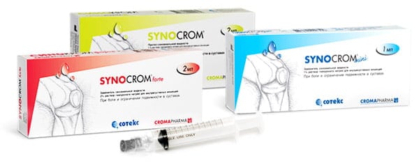 Еще один германский препарат на основе гиалуроната натрия. Производится компанией Крома Фарма. Выпускается в виде 2% раствора в шприцах объемом 2 и 4 мл. Курс лечения Синокромом обычно состоит из 3-х инъекций. Уколы делают с интервалом в одну неделю.