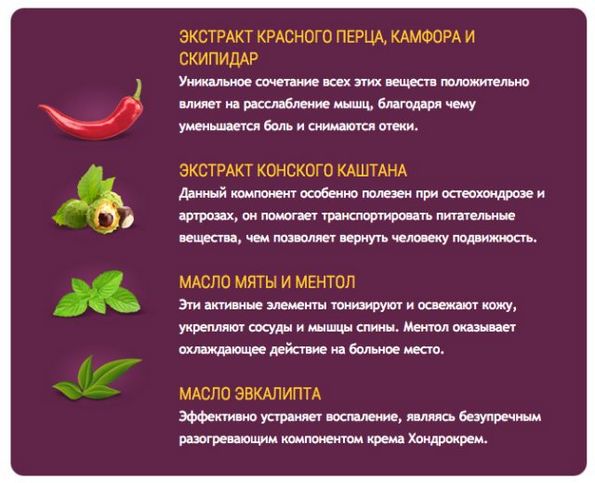 Лечебное действие Хондрокрема основано на фармакологических свойствах биологически активных веществ, входящих в состав масел и фитоэкстрактов. Это алкалоиды, биофлавоноиды, сапонины, горечи, слизи. В лекарственных растениях содержится много микроэлементов (кальций, фосфор, магний), водо- и жирорастворимых витаминов (тиамин, пиридоксин, ретинол, токоферол). Все они необходимы для правильной работы суставов, позвоночника, связочно-сухожильного аппарата.