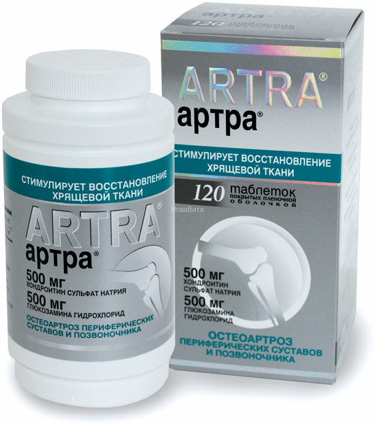 Комбинированное средство с активными ингредиентами глюкозамином и хондроитином. Артра часто становится препаратом первого выбора в терапии деформирующих остеоартрозов. Выпускается в виде двояко выпуклых таблеток, расфасованных в пластиковые флаконы №60, №90, №120. Часто определяющим критерием при выборе хондропротекторов становится сочетаемость Артры с глюкокортикостероидами.