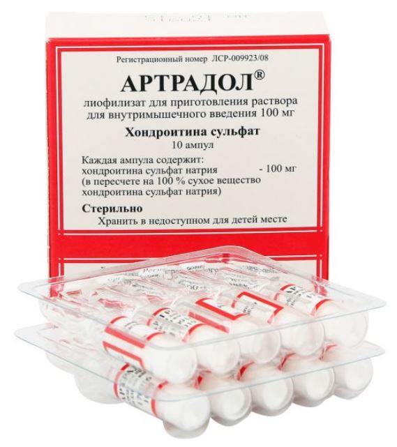 Лекарственное средство выпускается в виде лиофилизата, из которого готовят раствор для внутримышечного введения. Всего при лечении назначается от 25 до 35 инъекций. Спустя 2 недели лечения проявляется противовоспалительное и анальгетическое действие Артрадола. Оно сохраняется в течение двух месяцев после отмены препарата.