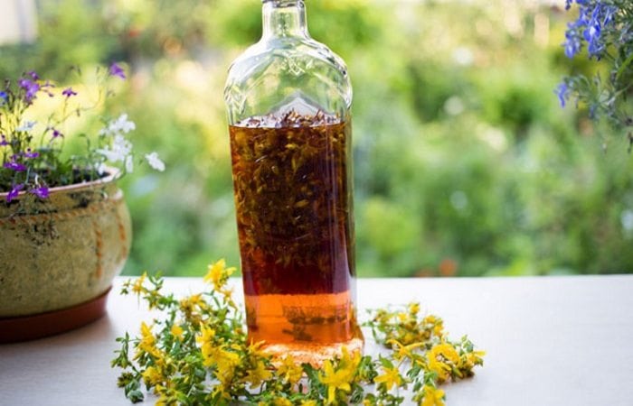 - спиртовая настойка с целебными травами. В емкость из темного стекла кладут цветки, литья, молодые корешки подорожника, репейника, зверобоя, одуванчика, ноготков. Слегка утрамбовывают, заливают водкой, настаивают месяц. Утром и вечером втирают 10-20 мл в больной сустав.
