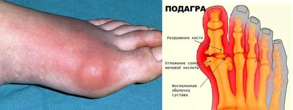 Подагра развивается в результате метаболических расстройств, спровоцированных нарушениями регуляции обмена пуриновых оснований. Это приводит к накоплению мочевой кислоты и ее кислых уратных солей в организме. В плазме крови повышается концентрация продуктов катаболизма пуринов, а ураты накапливаются в полости суставов, откладываясь в виде объемных кристаллов. Они раздражают хрящевые, мягкие, костные ткани, вызывая воспаление. Мочевая кислота перестает выводиться органами мочевыделительной системы, поражает почечные структуры, становится причиной развития нефропатии.