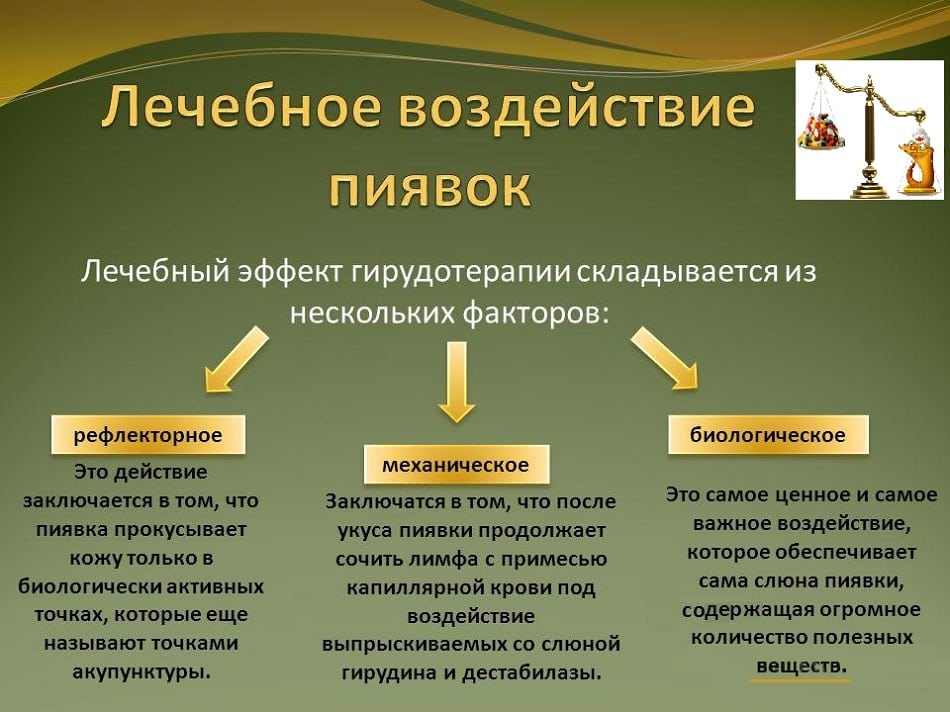 | Рефлексотерапевтическое | Кольчатые черви при постановке механически воздействуют на аккупунктурные точки, расположенные на теле человека. Такой эффект схож с иглоукалыванием, что позволило выделить отдельное направление натуропатии — гирудорефлексотерапию |