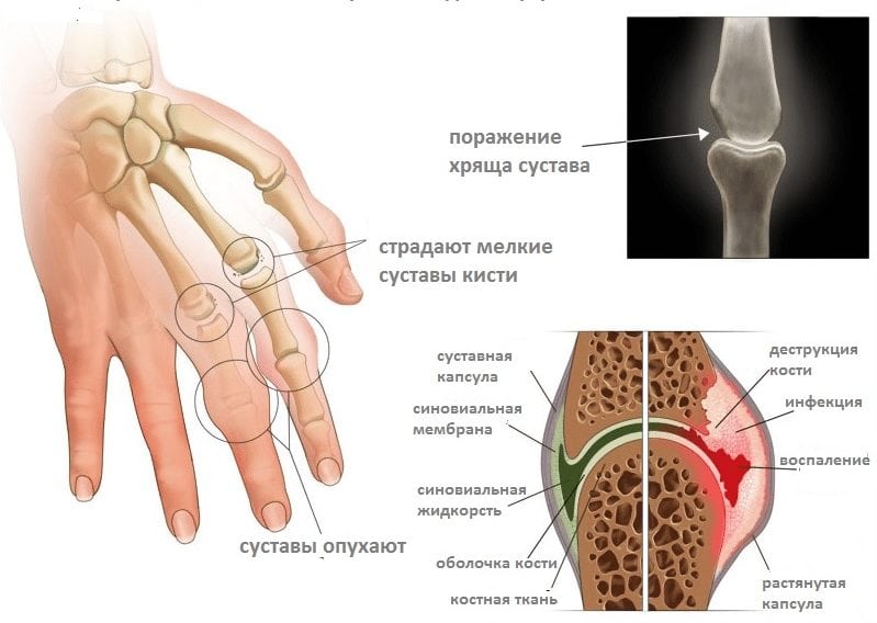 Заболевание обусловлено нарушениями иммунных ответов и активизацией вирусов Эпштейн-Барра, ретровирусов, цитомегаловирусов, микоплазм, вирусов герпеса или краснухи. Ревматоидный артрит проявляется болями в суставах, формированием воспалительных отеков, скованностью движений.