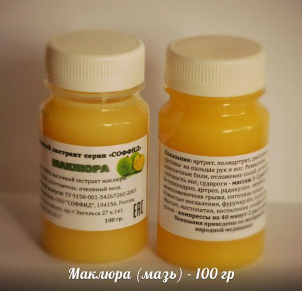 В народной медицине из маклюры готовят различные лекарственные формы, но чаще – отвары и мазь, которую прикладывают местно на больные суставы. Спелые плоды пригодны для изготовления настойки (понадобится спирт 40-50% концентрации).