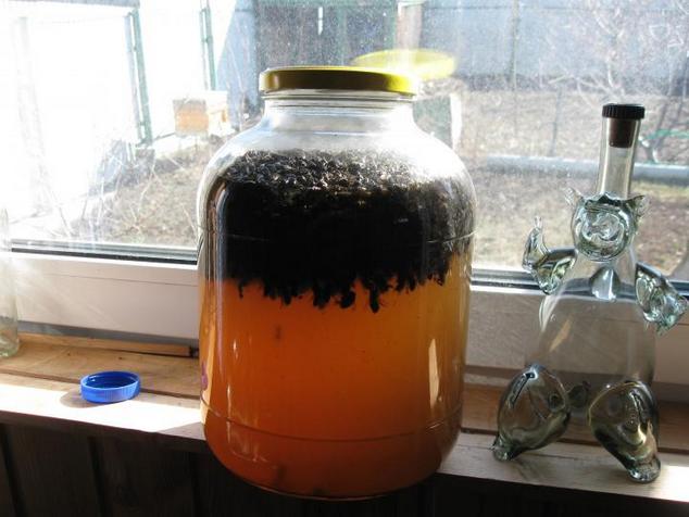 Настойку готовят и на воде. Банку на четверть заполняют подмором, заливают до верха холодной кипяченой водой, настаивают в прохладном темном месте 10 недель. Процеживают, хранят в холодильнике. Принимают по столовой ложке 3 раза в день во время еды.