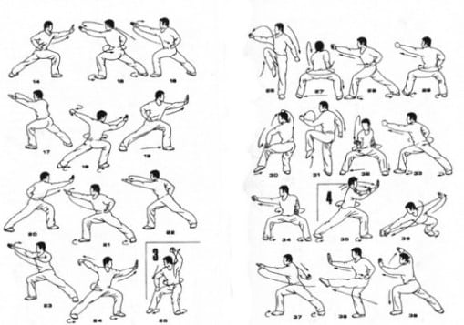 Кулаки прижать к плечам, ноги слегка согнуть и широко расставить. Расслабиться, а затем мгновенно сконцентрироваться и выпрямить руки, разогнув при этом кулаки. Через 2-3 секунды вернуться в прежнее положение. Запрещается чрезмерно резко распрямлять руки, движения должны быть быстрыми, но плавными. Это упражнение помогает улучшить состояние локтевых, коленных и голеностопных суставов, становится профилактикой гонартроза.