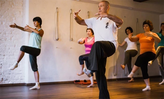 Встать прямо, немного расставить ноги, руки упереть в бока. Вытянуть ногу вперед, направляя носок к корпусу, замереть на 2-3 секунды, принять исходное положение. Имитируя удар, выставить ногу в сторону, удерживать в воздухе несколько секунд, принять исходную позицию. Плавно вытянуть ногу вперед, а затем отвести назад, как бы пытаясь ударить себя по ягодице. Повторить все движения другой конечностью. Упражнение рекомендуется выполнять людям с проблемными суставами коленей, голеностопов и бедер, а также страдающих от поясничного остеохондроза.
