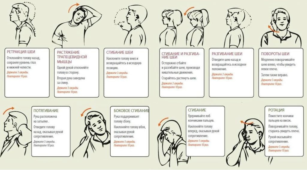 - в положении сидя тянуть голову вверх, а затем пытаться вжать ее в плечи по 15-20 раз.