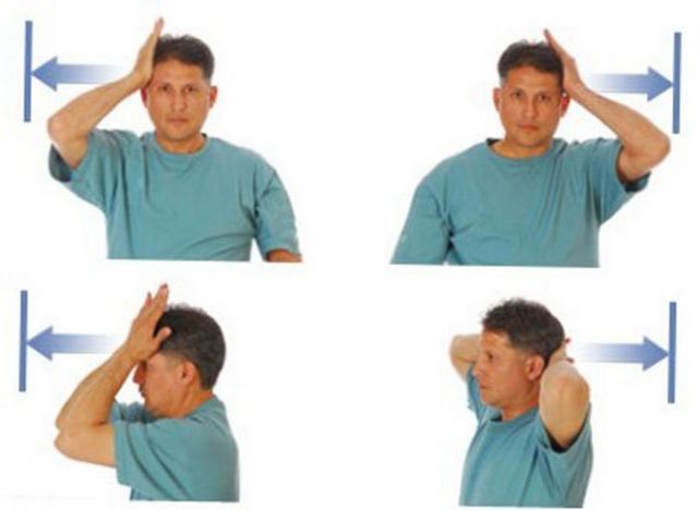 Сесть на табурет, правую руку положить на правую верхнюю часть головы. Сгибать шею вправо, оказывая сопротивление ладонью в течение 20 секунд. Затем принять исходное положение тела, уперев левую руку в левую боковую поверхность шеи. Пытаться наклонить голову влево, надавливая правой ладонью, одновременно оказывая сопротивление левой. Повторить все движения в противоположную сторону.