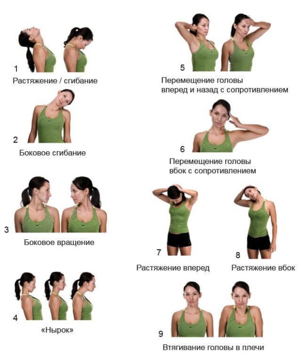 - встать прямо, руки положить на пояс, медленно наклонить голову вперед. Напрягать шейные мышцы в течение 10 секунд. Для усиления воздействия подставить кисть под подбородок. Вернуться в исходное положение, а затем запрокинуть голову, слегка давя ладонью на затылок;