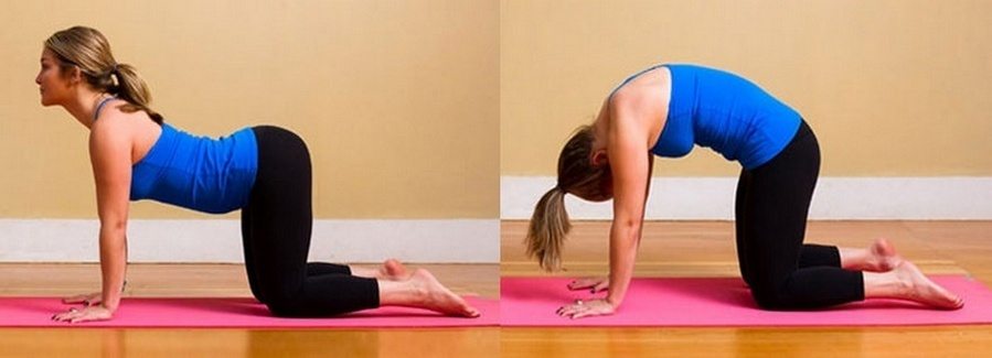 Встать на четвереньки, медленно выгибать, а затем прогибать спину. При правильном выполнении упражнения возникают приятные ощущения из-за растягивающихся мышц. В этом положении можно делать не слишком энергичные махи ногами, руками. Для закрепления лечебного результата нужно сесть и хорошо прогнуться назад.