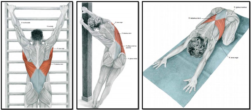 Сесть на коврик, поместить согнутые в коленях ноги справа от себя, удерживая их правой рукою. Вытянуть вверх левую руку и наклонять ее в правую сторону до появления ощущения максимального напряжения левых боковых мышц спины. Задержаться в этой позиции на 20 секунд, плавно вернуться в исходное положение. Повторять упражнения по 5 раз в каждую сторону.