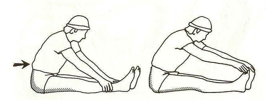 - медленно наклоняемся вперед, охватываем руками пальцы ног. В таком положении нужно задержаться на несколько секунд. В случае невозможности охвата пальцев в силу физиологических особенностей организма или телосложения не следует перенапрягаться, а просто использовать полотенце, накидывая его на ноги, как петлю.