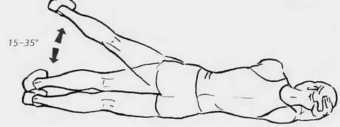 - неспеша поднимаем вверх прямую ногу с задержкой в 3-5 секунд, затем замедленным способом опускаем её вниз до полного расслабления. То же выполняется другой ногой. Главная задача такого лечебно-профилактического действия – это прокачать мышцы бедер, не беспокоя тазобедренные сочленения;