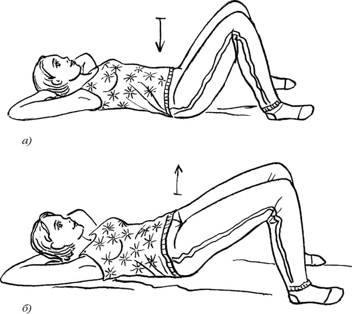 - изогнутые ноги под углом 90º следует немного раздвинуть чуть шире тазобедренного отдела. Неспешно поднимаем таз, прогибаясь как можно выше, с задержкой положения на 3-5 секунд. Медленно опускаем таз, стараясь не касаться поверхности пола.