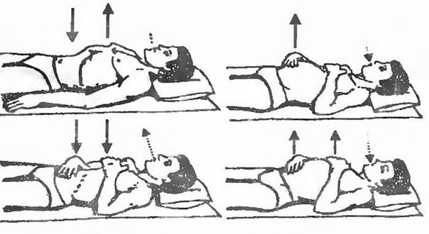 - лечь на спину, постараться максимально расслабиться. Сделать глубокий вдох, ощущая слабое напряжение в пояснице, через 3 секунды выдохнуть;