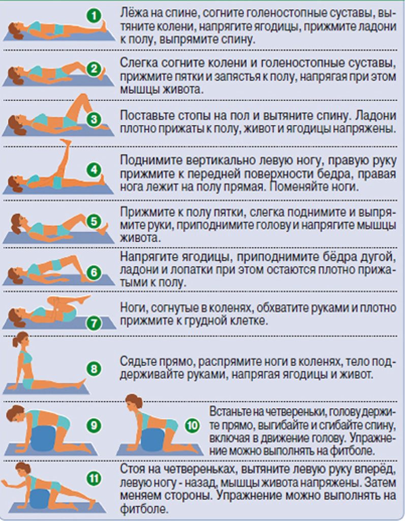 Количество повторов каждого упражнения — от 7 до 10. В подостром периоде запрещены любые активные движения, в том числе для растяжения мышц спины.
