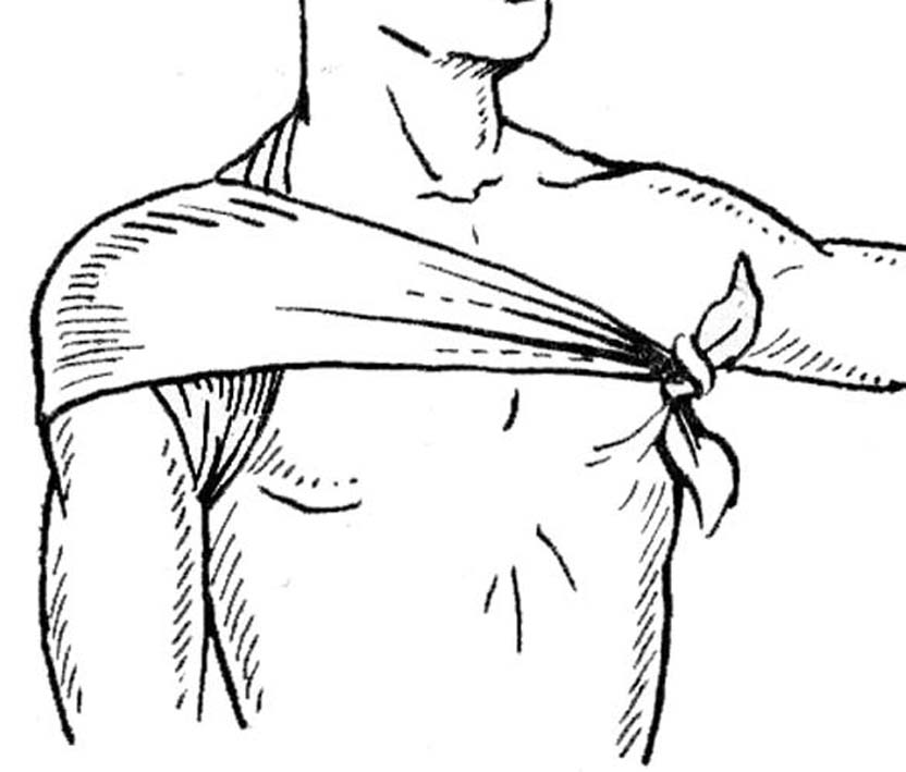 Бинтование продолжается до полного закрытия плечевого сустава, всей поверхности плеча и подмышки. По окончании фиксации конец бинта крепится к нескольким слоям материала на спине безопасной булавкой.