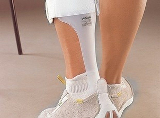 При синдроме «отвисающей стопы» пациентам рекомендовано использование специального ортеза, состоящего из двух независимых частей. Их соединяет только эластичный шнур, длина которого регулируется. Основная задача такого приспособления — подъем стопы при движении для правильного сгибания голеностопного сустава.