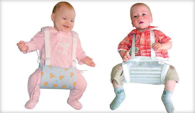 Частой причиной дисплазии тазобедренных суставов в грудном возрасте становится ягодичное предлежание плода в материнской утробе. Вскоре после рождения проводится полное обследование ребенка. При обнаружении патологии сразу начинается лечение. При выборе методов терапии детскими ортопедами учитывается степень неполноценности тазобедренного сочленения. Для лечения диспластических изменений суставов применяются специальные приспособления для постоянного ношения.