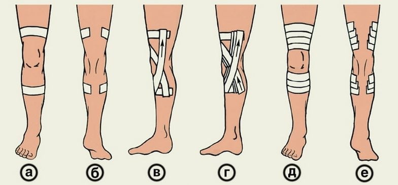 Тейпирование может быть лечебным, функциональным или реабилитационным. Выбор способа наложения клеящих лент обусловлен причиной повреждения составляющих коленного сустава, степенью тяжести травмы или патологии.