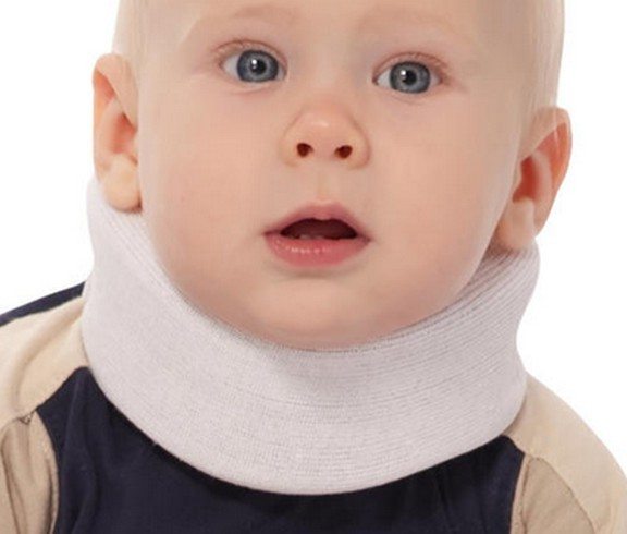 Ортопедический воротничок сделан из поролона и оснащен липучками с обеих сторон, благодаря которым можно регулировать объем приспособления. Внешне оно схоже с ошейником. Назначением шины занимается специалист, поскольку при неправильном выборе и использовании развивается атрофия мышц. В таком случае малыш вследствие слабых мышц к двум месяцам не будет в состоянии держать головку. Носить воротник можно до года.