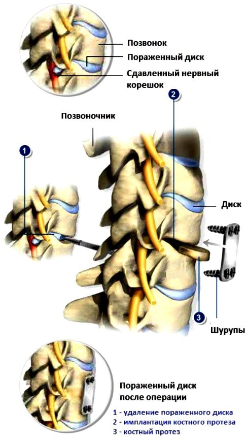 При развившихся осложнениях, которые не устраняются длительным проведением консервативной терапии, пациенту рекомендовано хирургическое лечение. После операции срок, необходимый для реабилитации, определяется выбранным методом вмешательства, скоростью восстановления больного. Применение малоинвазивных хирургических манипуляций не требует длительного больничного — достаточно 2 недель, чтобы пациент мог вернуться к облегченному труду. При полостных операциях с иссечением грыжевого выпячивания и межпозвонкового диска реабилитация займет до 6 месяцев.
