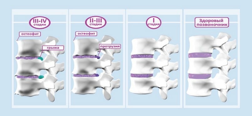 Интенсивность клинических проявлений заболевания зависит от степени деструктивных изменений межпозвонковых дисков. По мере прогрессирования остеохондроза они уплощаются, а расстояние между позвонками неуклонно сокращается. Полное разрушение дисков обычно заканчивается потерей работоспособности.