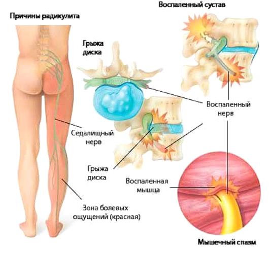 Толчком к возникновению воспалительного процесса могут послужить переохлаждение, травмирование позвоночника, респираторные, урогенитальные патологии, нейровирусные заболевания, осложненные корешковым синдромом, например, клещевой энцефалит. Болезненные ощущения появляются при поднятии тяжестей, неловких движениях, инфекциях, простуде, из-за растяжения или разрыва фиброзного дискового кольца. Студенистый диск смещается, что провоцирует формирование межпозвоночной грыжи. Выдвинутый диск, костные наросты давят не только на спинномозговые корешки, но и на расположенные рядом ткани.