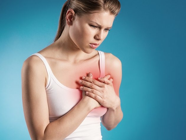 При остеохондрозе первыми появляются боли в груди. Они нечетко локализованы, могут отдавать в руки, в область ключицы, ребра. Боли в сердце выражены сильно или умеренно, напоминают приступ стенокардии, не устраняются приемом нитроглицерина. Иногда они похожи на ощущения, возникающие при обострении холецистита, панкреатита. Но в отличие от поражений поджелудочной железы или желчного пузыря боли не сопровождаются повышенным газообразованием, изжогой, вздутием живота.