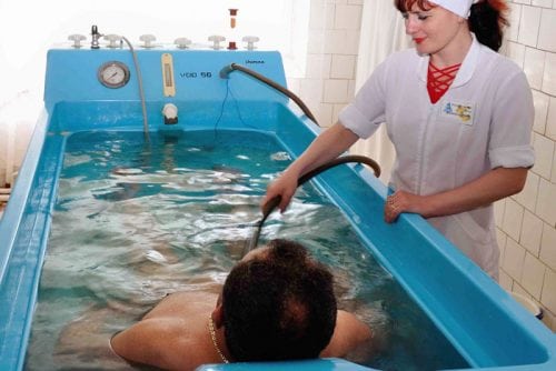 • физиотерапевт. Лазеротерапия, магнитотерапия, УВЧ-терапия, фонофорез, электрофорез активно используются на стадии реабилитации. Физиотерапевт выберет комплекс мероприятий индивидуально для каждого пациента. В физлечебницах также делают аппликации с озокеритом, парафином, бишофитом. В терапии остеохондроза применяются ванны с грязями, минеральными водами;
