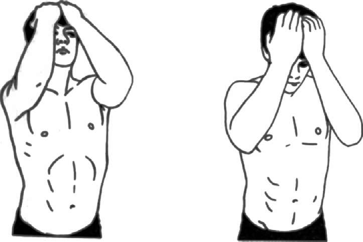 - Исходное положение — сидя прямо. Надавить ладонью на лоб, при этом оказывая сопротивление головой. Шея и спина должны оставаться прямыми.