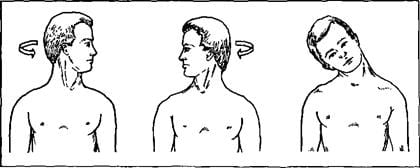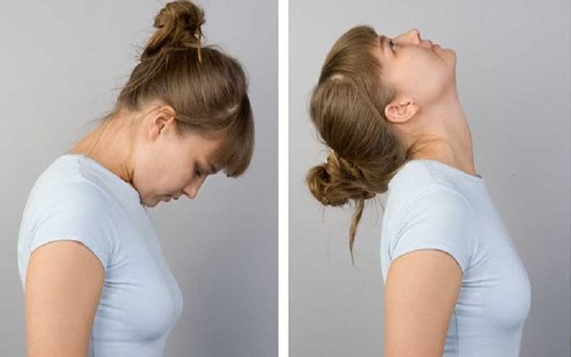 - Сидя прямо, голову наклонить вперед, стремясь коснуться груди подбородком. На вдохе неторопливо запрокинуть назад голову. Выполняется 8-10 подходов.