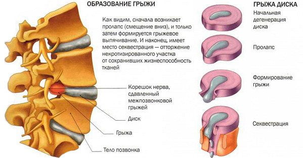 Чтобы пульпозное ядро оказалось за пределами межпозвонкового диска, требуется довольно много времени. Формирование поясничной грыжи проходит в несколько этапов.