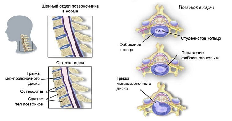 Шейный остеохондроз развивается из-за расстройства трофики (питания) межпозвонковых дисков. Они утрачивают способность удерживать влагу, поэтому истончаются и уплотняются, а затем смещаются за пределы позвоночного канала. Для стабилизации позвоночного столба во время движения начинают формироваться костные наросты (остеофиты).
