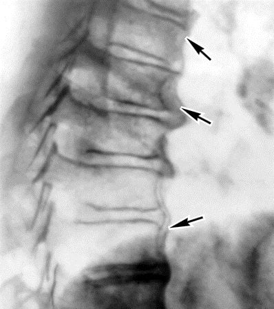 По мере прогрессирования заболевания межпозвонковые диски уплощаются, а расстояние между позвонками уменьшается. Формируются костные наросты (остеофиты), травмирующие мягкие ткани, сдавливающие кровеносные сосуды и нервные корешки. Это приводит к еще большему обострению симптоматики.
