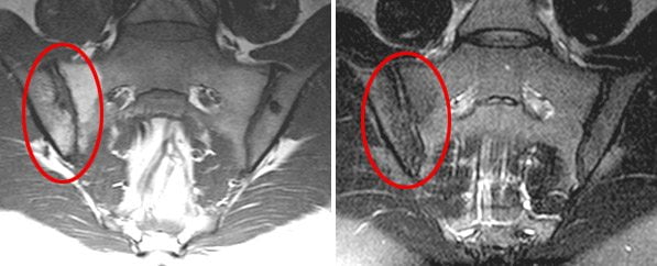 Магнитно-резонансная томография (МРТ) наиболее информативна в диагностике сакроилеита на самых ранних стадиях. Она позволяет выявить первые признаки воспалительного процесса в суставе – жидкость в суставной полости и субхондральный отек костного мозга. Эти изменения не визуализуются на компьютерных томограммах (КТ).
