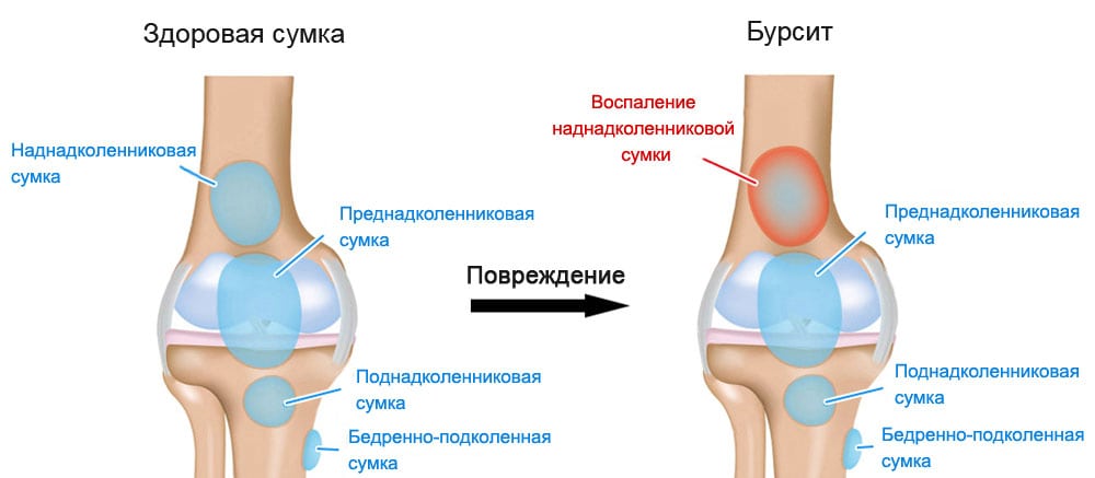 Для этого заболевания, как и для синовита, характерно воспаление синовиальной оболочки. Но при бурсите патология локализована и не выходит за пределы суставной сумки. Ведущие симптомы — незначительный отек колена, покраснение кожи, боли при ходьбе, скованность движений. Но есть у заболевания и специфический признак. Если ощупать колено, то можно обнаружить небольшое уплотнение, при надавливании на которое ощущается перемещение в нем жидкости (флюктуация). Кожа над уплотнением разглаживается, становится чрезмерно упругой.