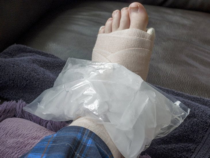 - В первые 2 часа после травмы прикладывать к пораженному суставу холод на 15-20 минут с получасовыми перерывами. Он уменьшит болевые ощущения, воспаление, отек. В качестве охлаждающего материала можно использовать кубики льда или замороженные продукты, завернутые в полотенце. Прямой контакт льда с кожей запрещен, поскольку можно спровоцировать нарушение кровообращения и обморожение тканей.