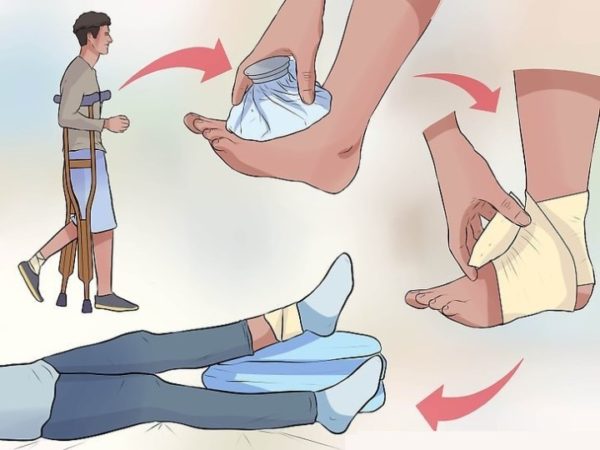 Вначале лечения пострадавшему показан полупостельный режим. Больной должен большую часть дня проводить в постели, придав ноге возвышенное положение. Голеностоп следует приподнять с помощью валика. Оптимальный уровень расположения сустава — немного выше сердечной мышцы. Это способствует быстрому рассасыванию воспалительных отеков, устранению болезненных ощущений.